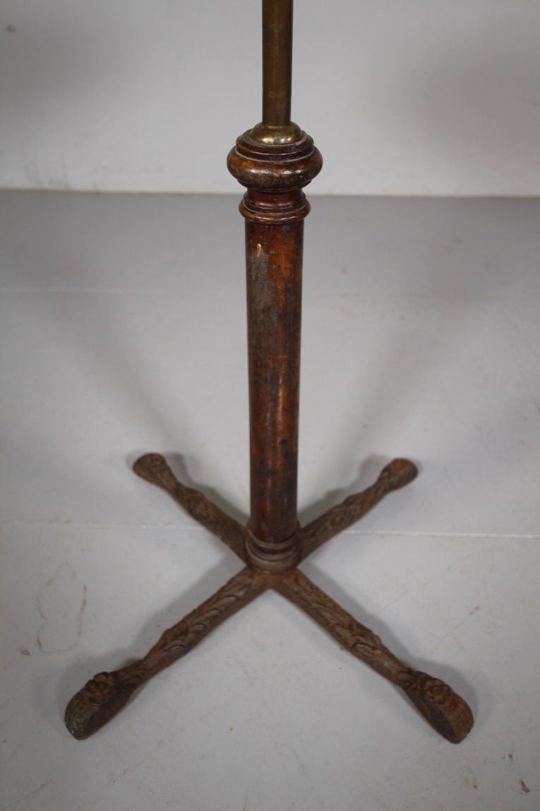A good quality English antique shaving mirror stand with a circular mahogany table on a turned mahogany base with four iron legs. Perfect for a bathroom, for shaving and makeup. The circular mirror is double sided, one side more magnified that the other. Fully adjustable in height. All works smoothly and is in very good condition. Dates to around 1850.