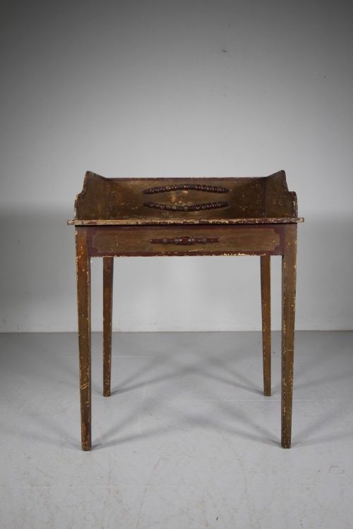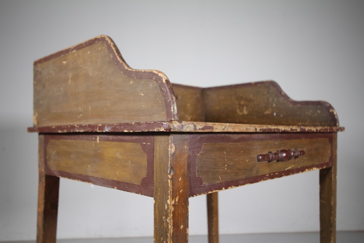This is a lovely English antique original painted pine side table that even has its original line decorations to the decorative up stand back, front and sides. A beautiful drab paint colour and decorated with shapely mouldings to the front and back. In very good, solid condition, a lovely English piece of original painted pine antique furniture. Height to the work top is 77cm.