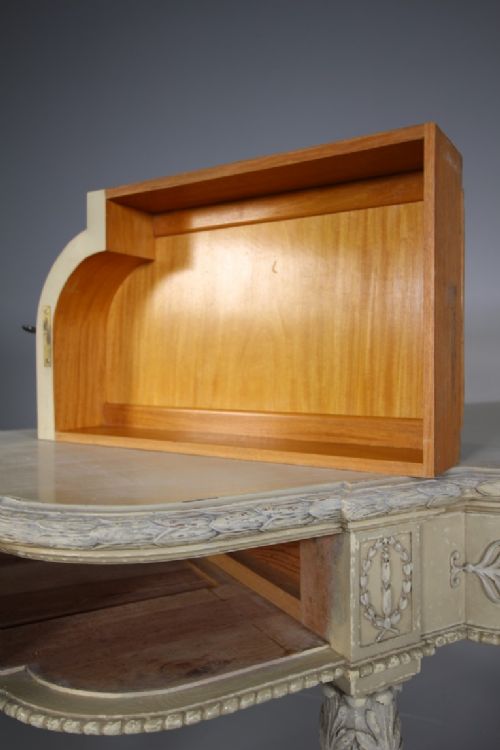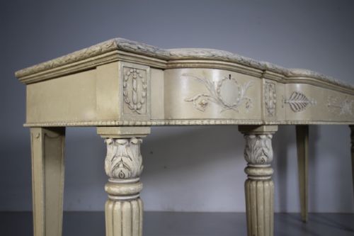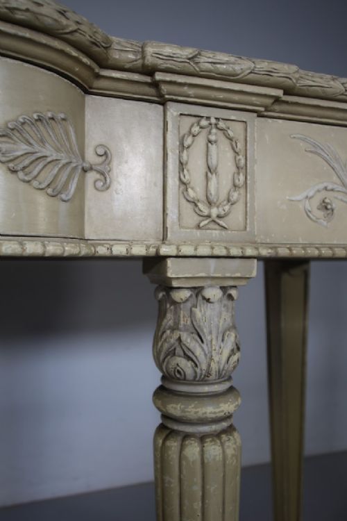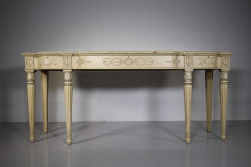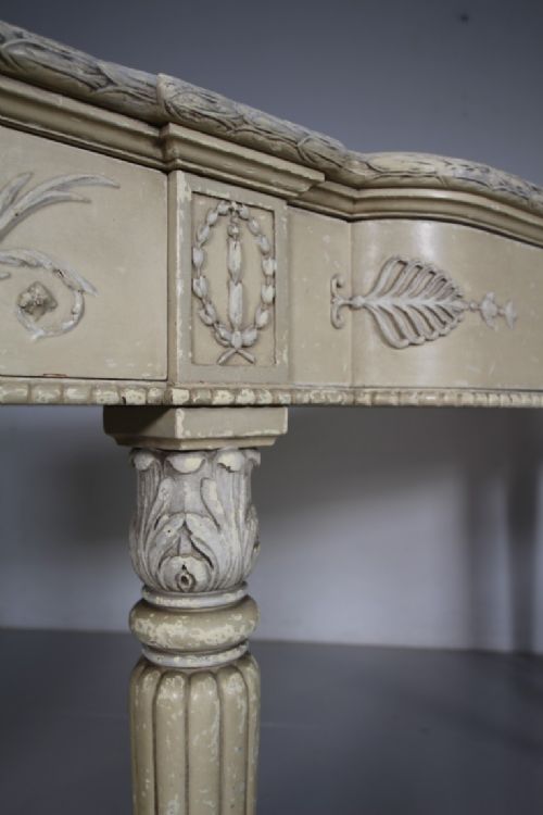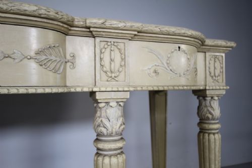A very high quality, late 19th century English antique serving table of superb scale. Still in the original intended antique cream paint finish, this English antique console / serving table features three shaped flush drawers within the frieze, these are decorated with classical shapes and foliage, all three run smoothly and open with a key. Standing on four fluted front legs with acanthus carved tops and with inset moulded rear legs. In superb condition throughout, a very high quality made English antique console table that dates to around 1890-1900.