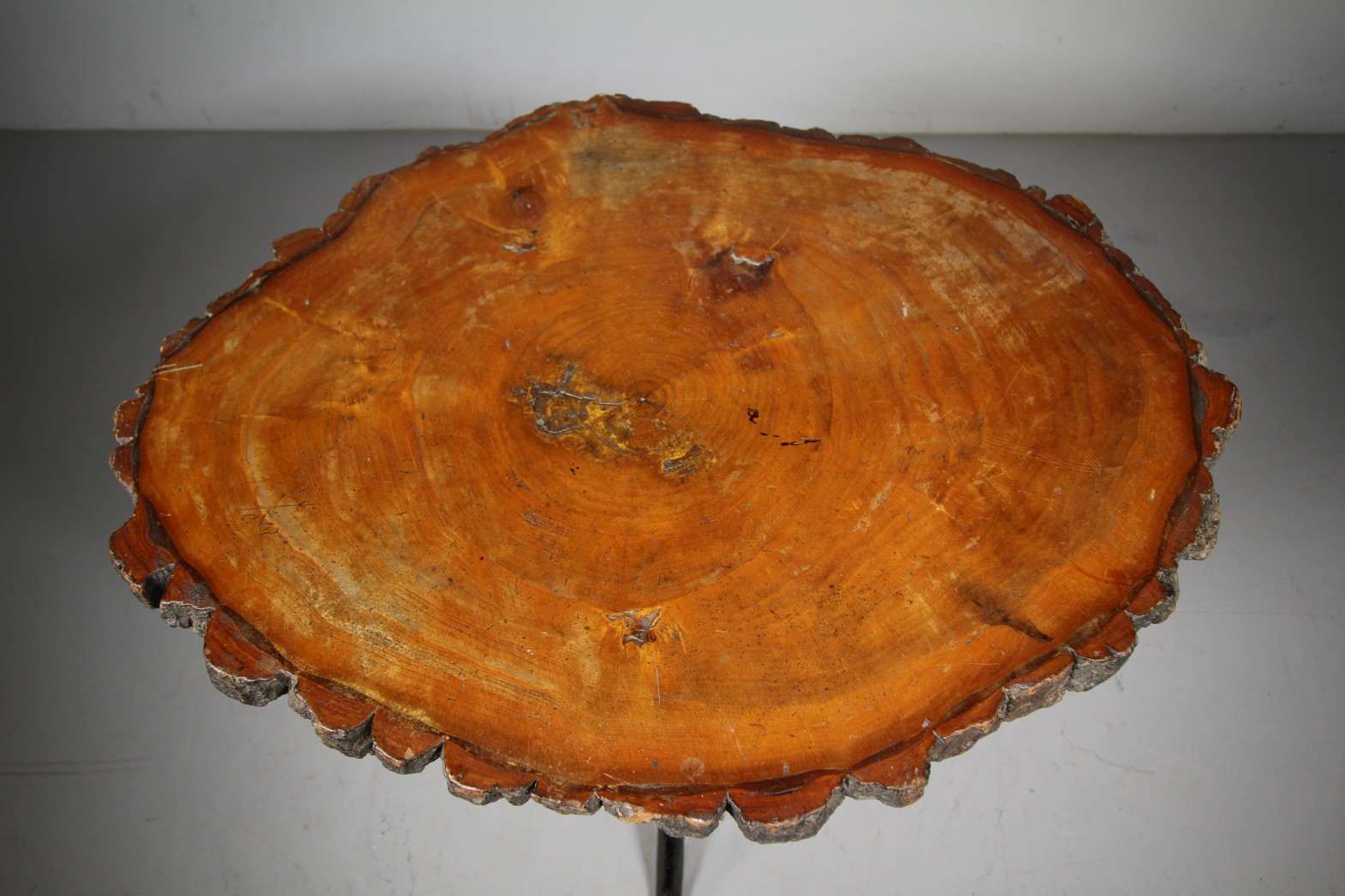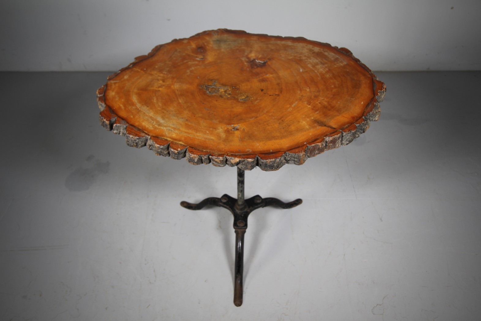 A sizeable English early 20th century side table that has a wonderful, single piece timber top that has a lovely natural / live bark edge, this is upon a sturdy English iron table base that has shapely tripod legs. In excellent condition and a superb colour to the timber table top.