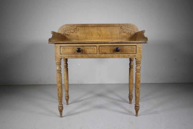 A lovely original painted pine English antique side table that is in very good condition, all sold and with a beautiful faux marble hand painted table top along with line work decorations. Dating to around 1840, this antique painted side table has a shaped up stand with scrolling sides, two drawers to the front that open freely and have the original ebonised handles. A decorative piece of English original painted pine furniture.