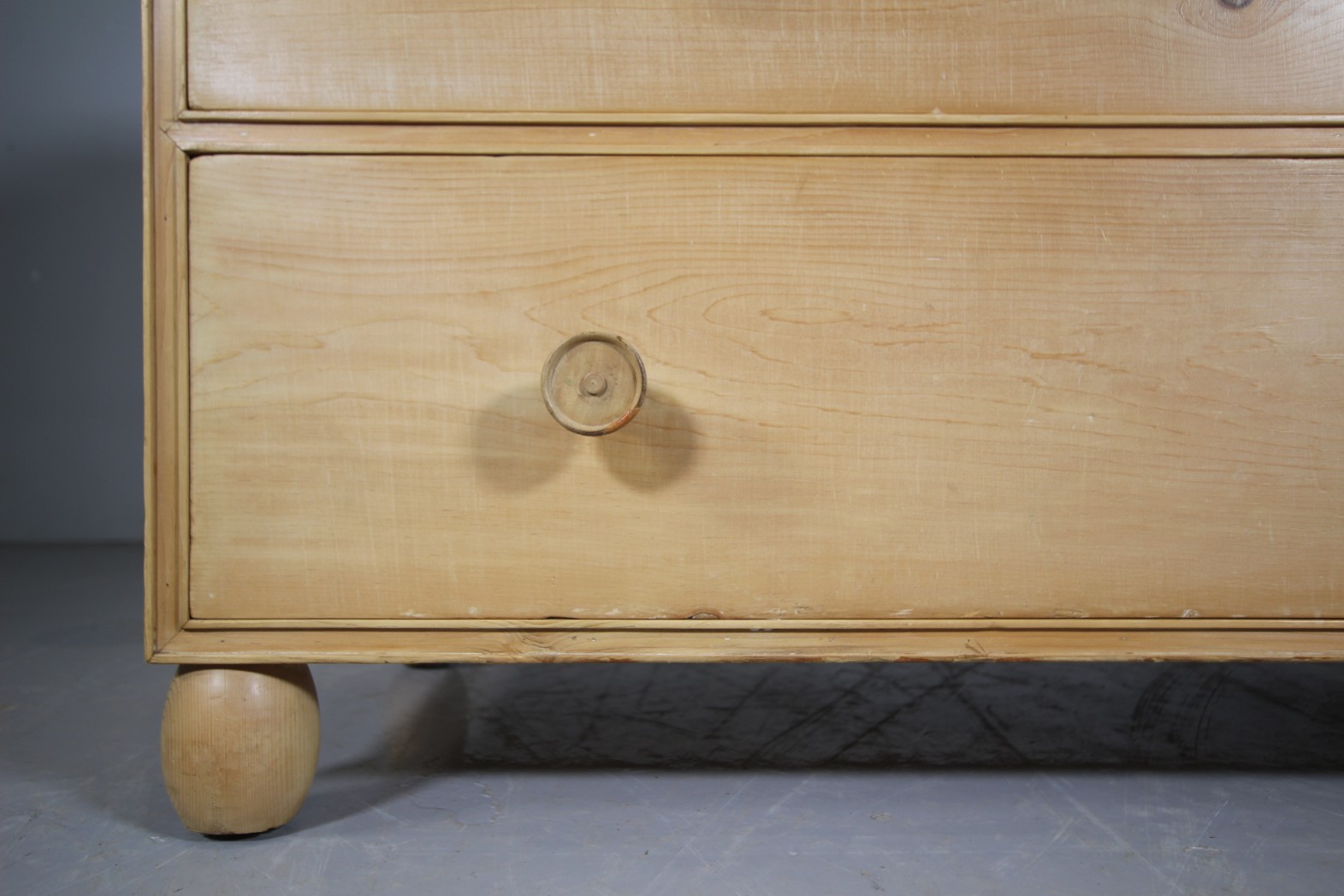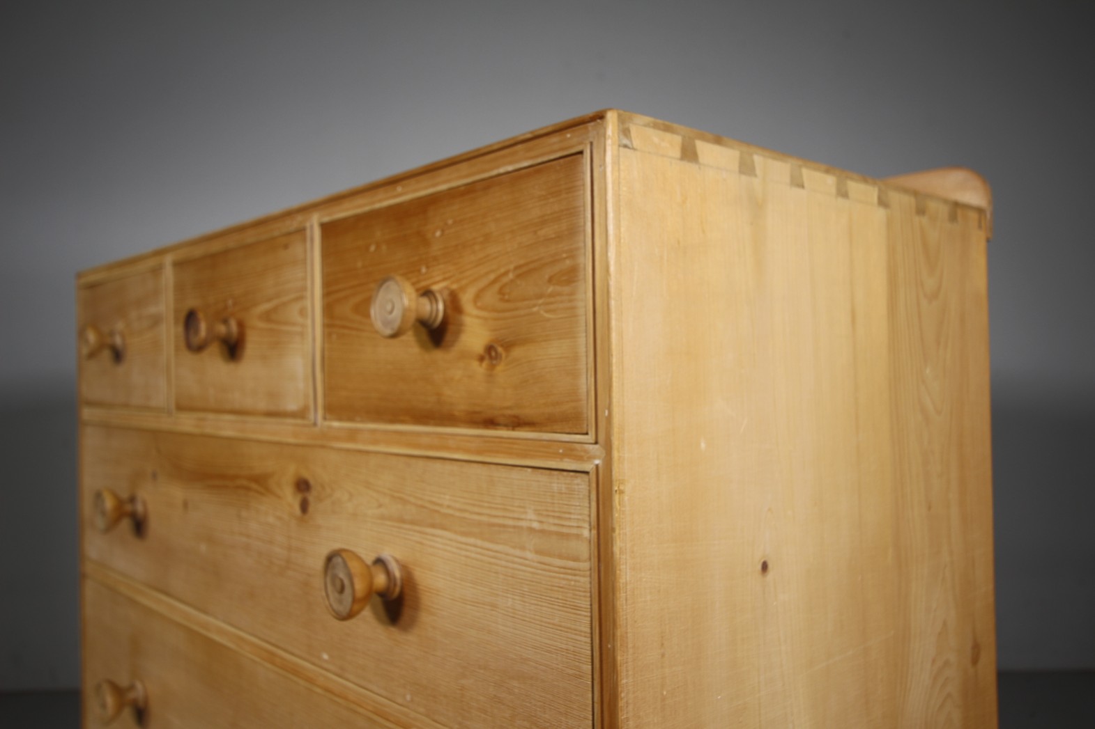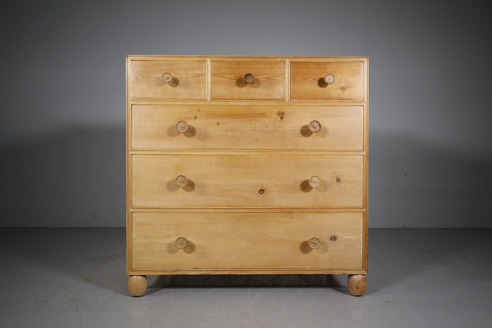 Heals of London didn’t make a large amount of chest of drawers in pine, but when they did, they were very high quality and wonderfully made. The pine used is a lovely pale variety and this Heals chest has a more unusual drawers arrangement, having three shorter square drawers along the top with three long and graduating drawers beneath. All six channel moulded drawers have finely cut dovetails, have the original knob handles and they all run well. To the top of this Heals pine chest is an original up stand and the chest stands on lovely oval original feet. In superb condition, all very clean with exposed dovetails to the chest sides. In the natural bare pine finish as intended when made, this Heals chest has never been painted. Circe: 1920.