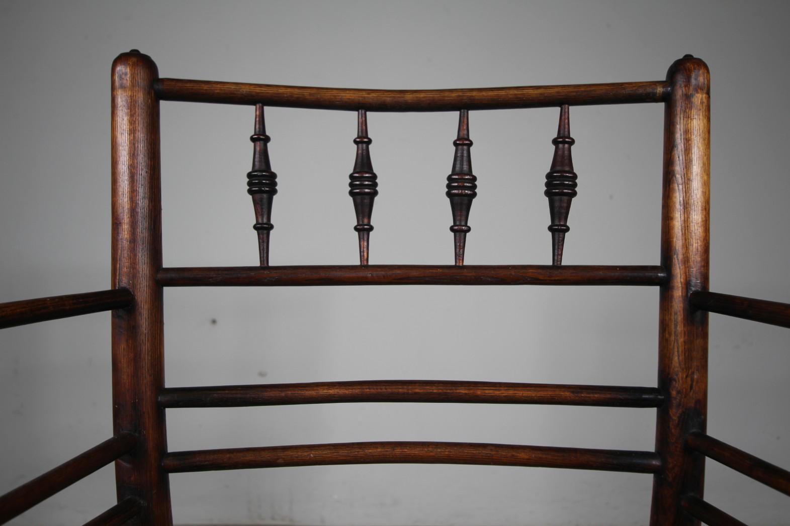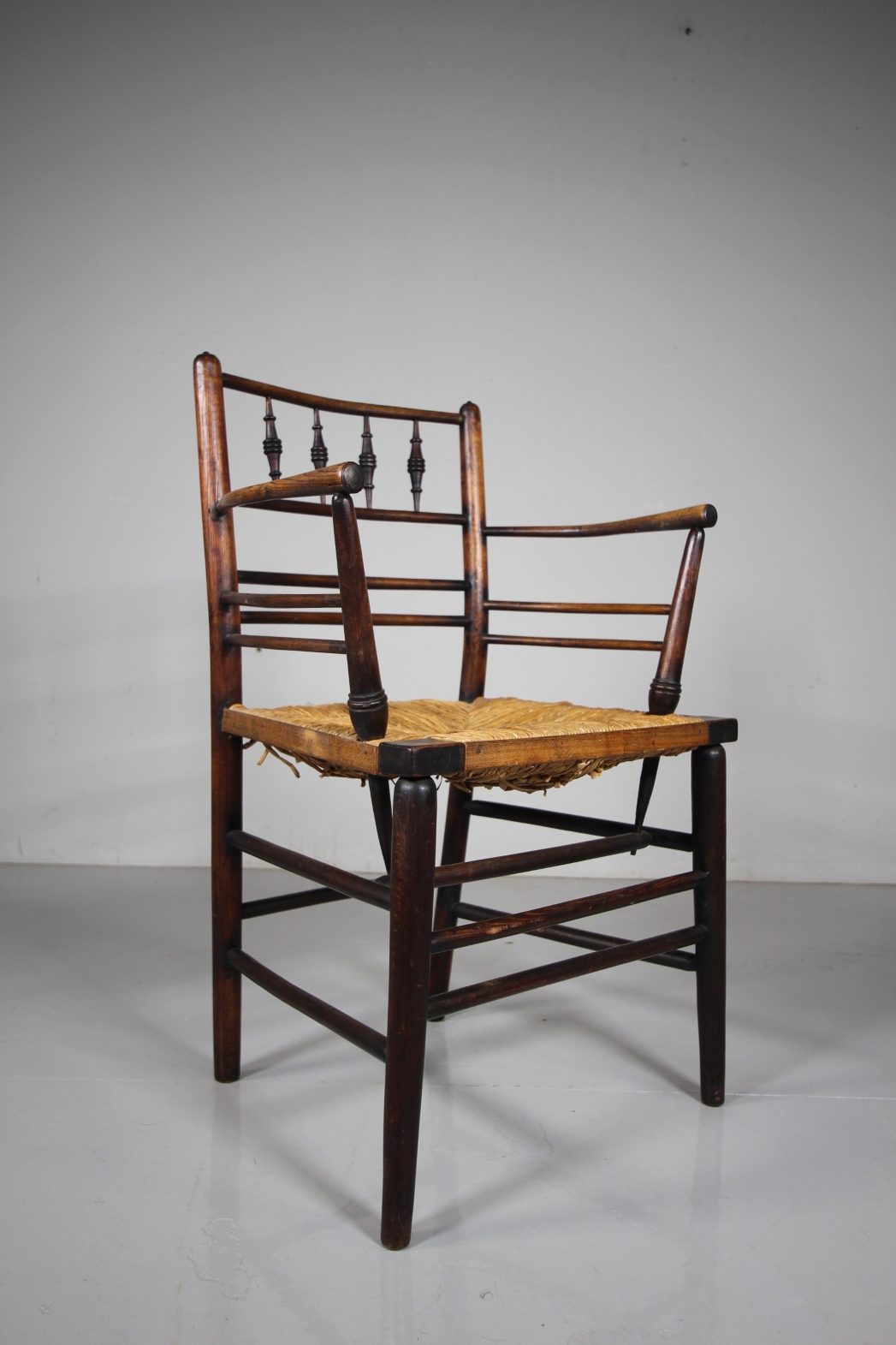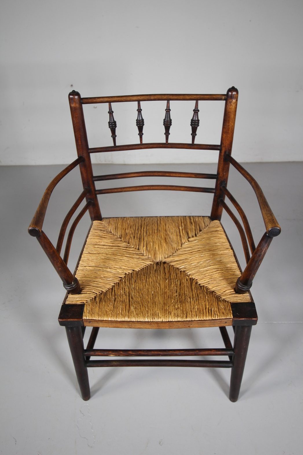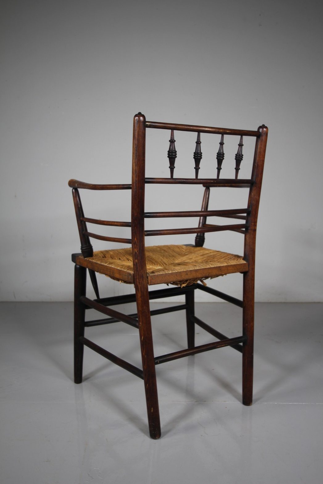 A very original 19th century antique William Morris Sussex armchair, full height and still in the original rich finish with the traditional original rushed seat all very intact. Dates to around 1870 with lovely bobbin turning to the back rests and with all the correct connecting stretchers under the seat. Perfect dining height, or as an Arts & crafts antique desk or side chair. A very good, clean example.