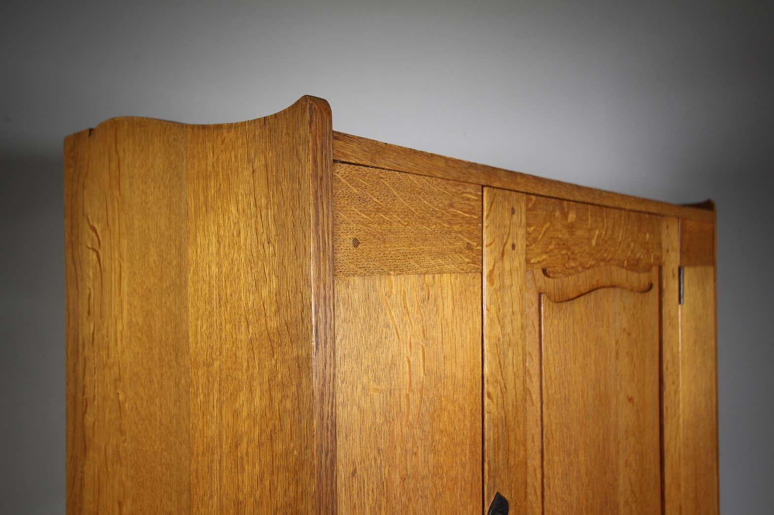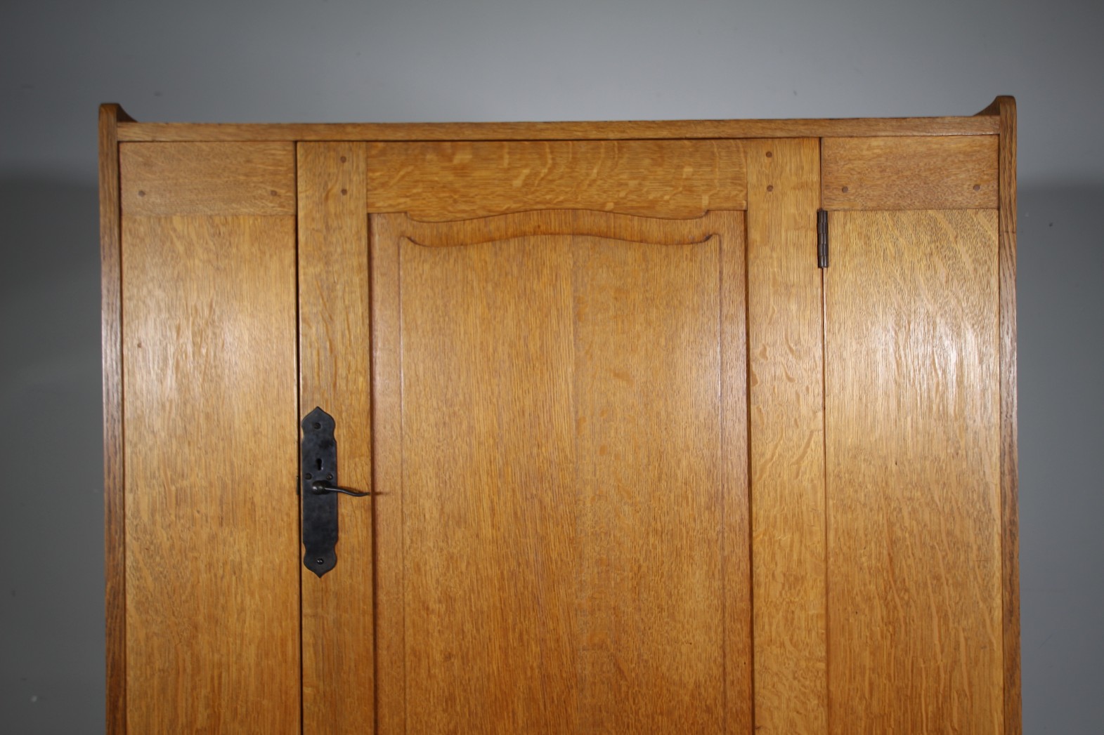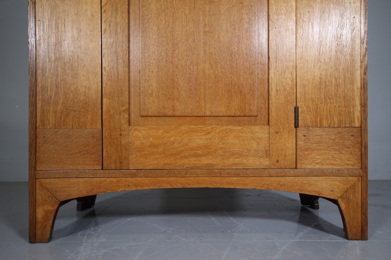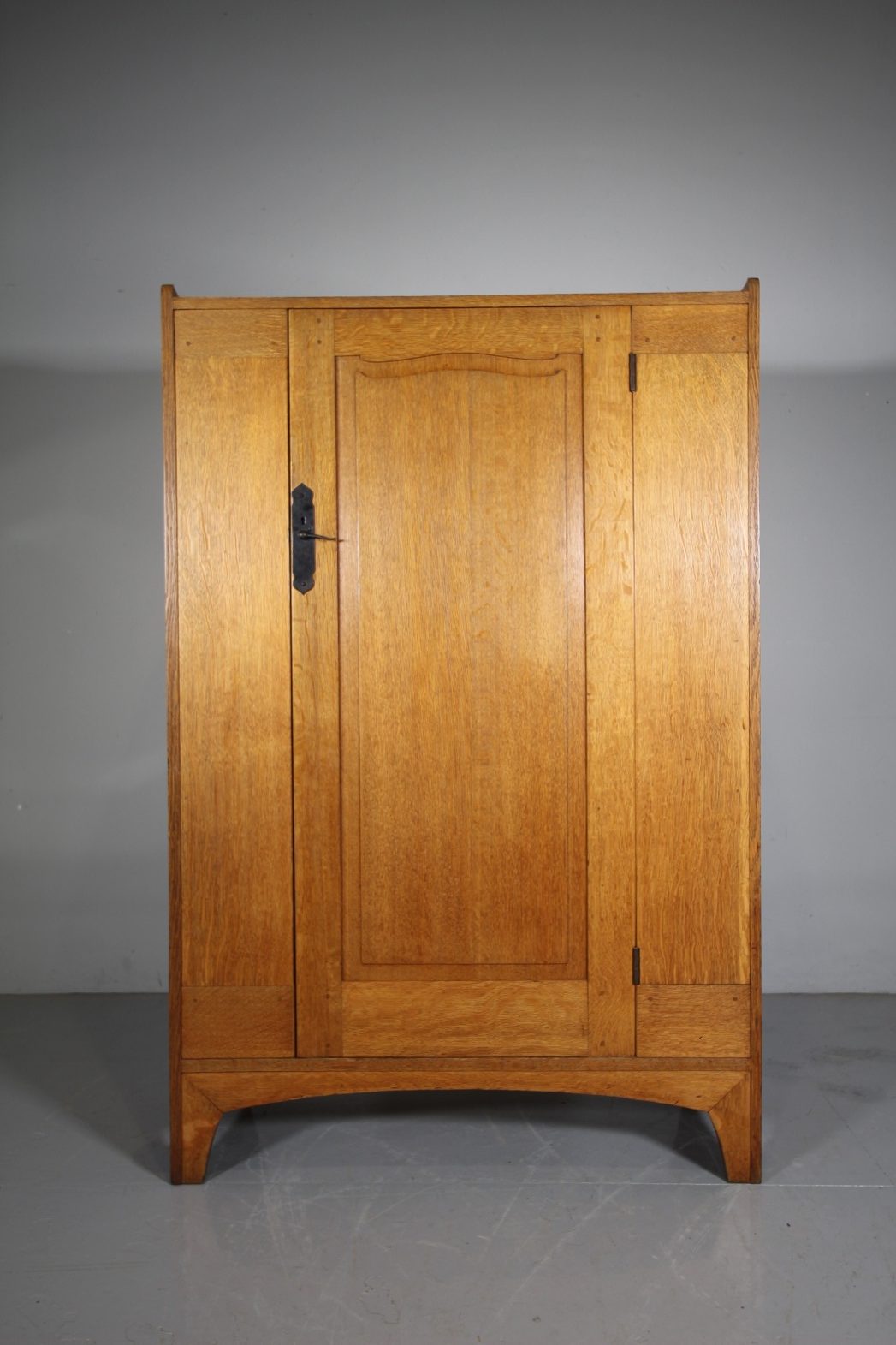This is a super quality, solid oak late 19th century antique wardrobe / hanging cupboard by Ambrose Heal, one of his earliest designs, can be seen illustrated in the Heals book by Oliver Heal. In superb, original condition, this Heals antique wardrobe has a single panelled door with shaped sides and a bracketed base. Complete with the original Guild of Handicraft iron handle, backplate and with all the original brass hanging hooks and a hanging clothes rail. All pegged and in very clean condition. A lovely example of an early and documented piece of Heals antique oak furniture that is a very good original colour.