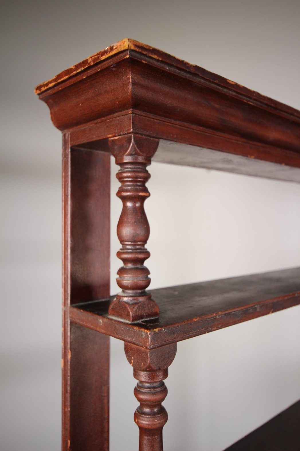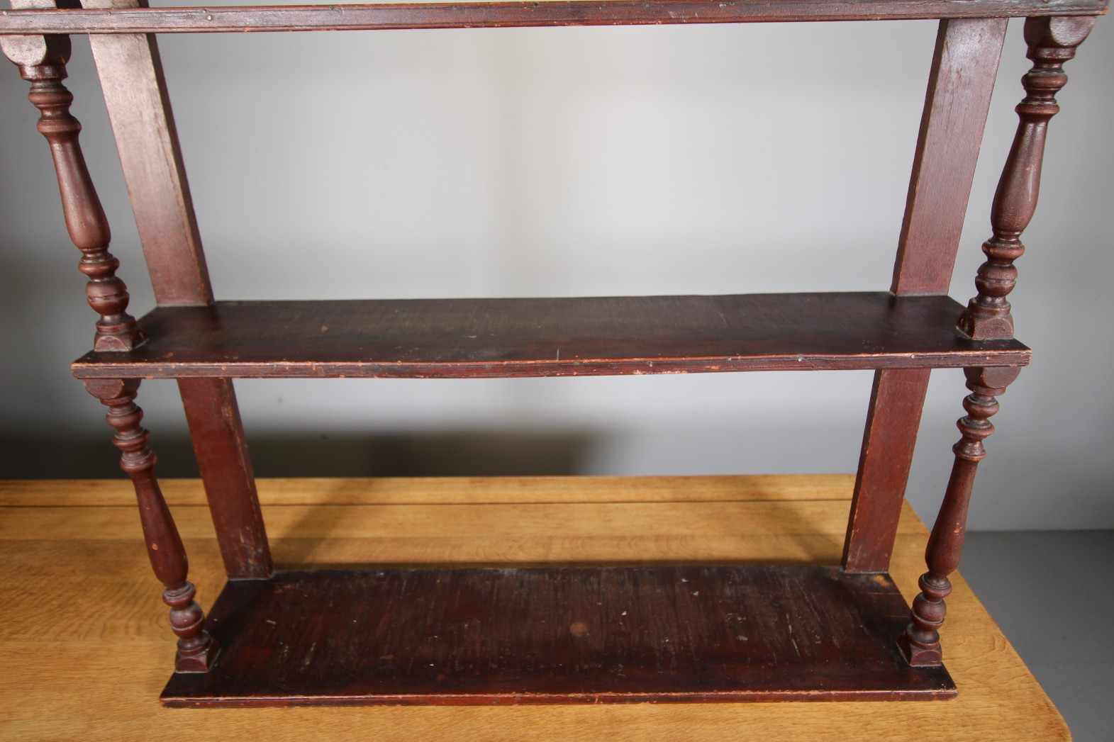Still in the original Regency paint finish, this is a lovely English early 19th century antique waterfall tiered open bookcase, designed to be wall hung. In excellent condition and featuring nicely turned shelf supports with stepped fronts that gradually become deeper. Original painted pine English antique wall shelves are becoming rarer to find in such honest condition.