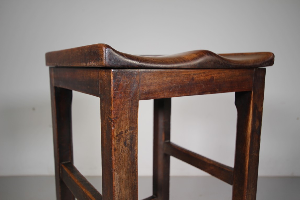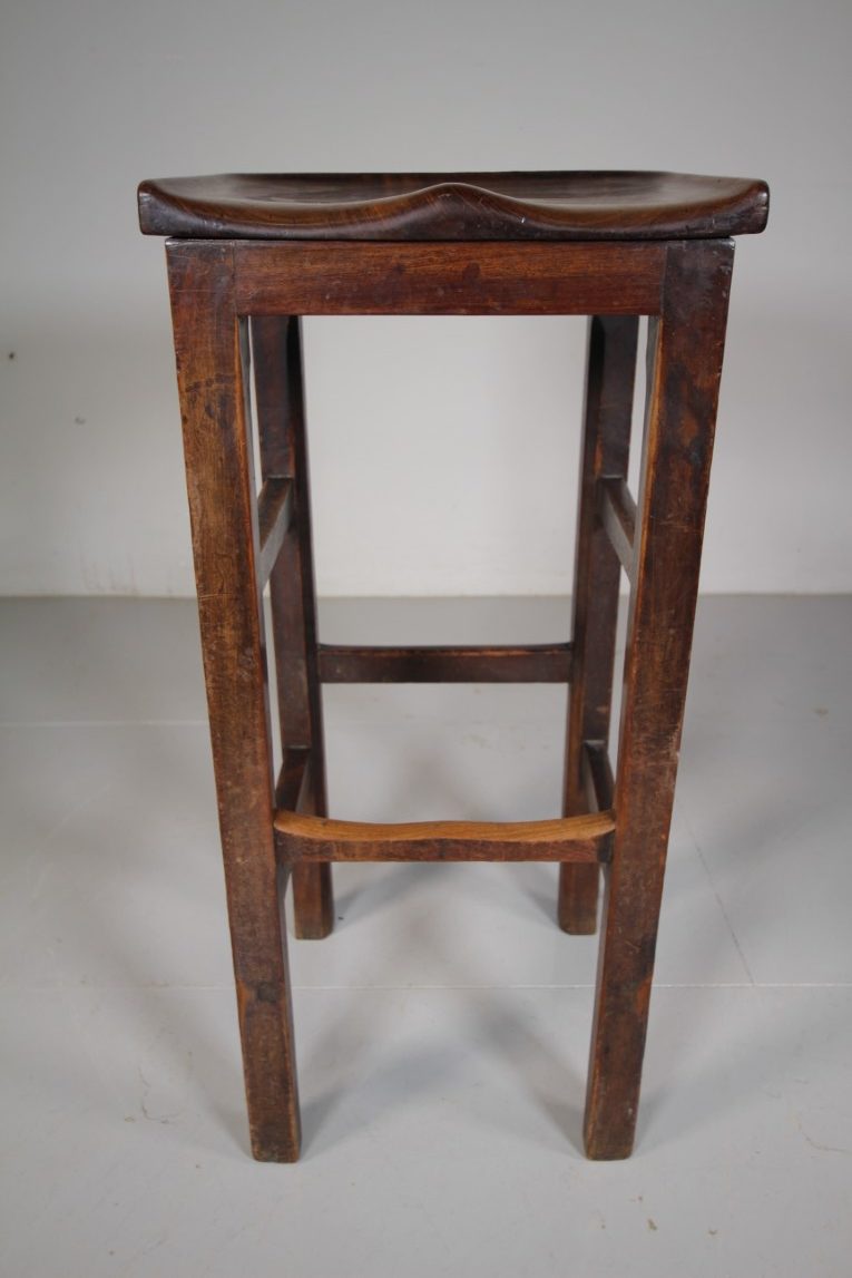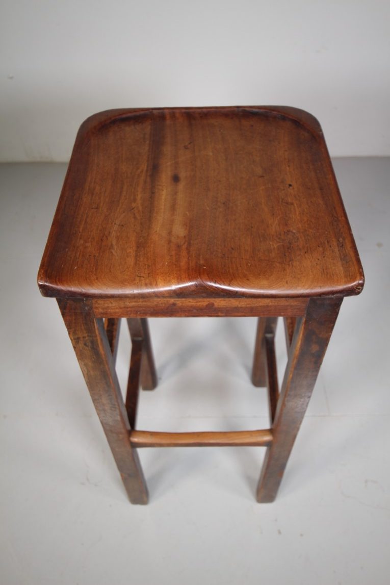 A tall English antique stool, very well made in solid mahogany with strong square legs that are joined by stretchers and with a lovely, comfortable shaped seat. The mahogany used is a great colour, perfect for a bar stool or at a kitchen island, as well as a an artist’s studio stool. Dates to around 1850.